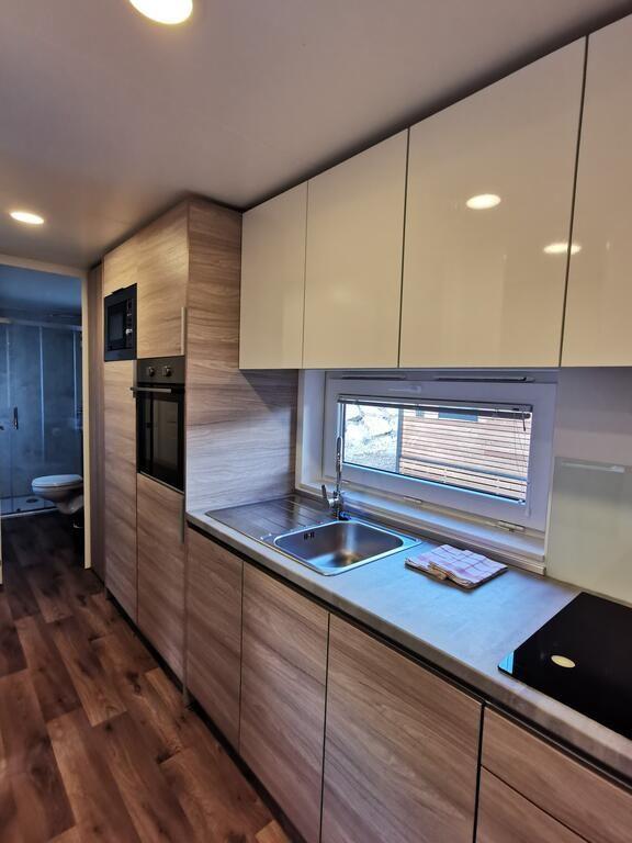 Klient si vybral model 1005 C21 s velkými panoramatickými dveřmi a okny a zajímavou kombinací vnějšího obložení v antracitové barvě a modřínového dřeva. Interiér je řešen dvěma ložnicemi, prostornou koupelnou a velkým centrálním prostorem s plně vybavenou kuchyní. S mobilními a modulárními domy, jako jsou Aurora a Alpline, může kemp fungovat jako celoroční ubytování.